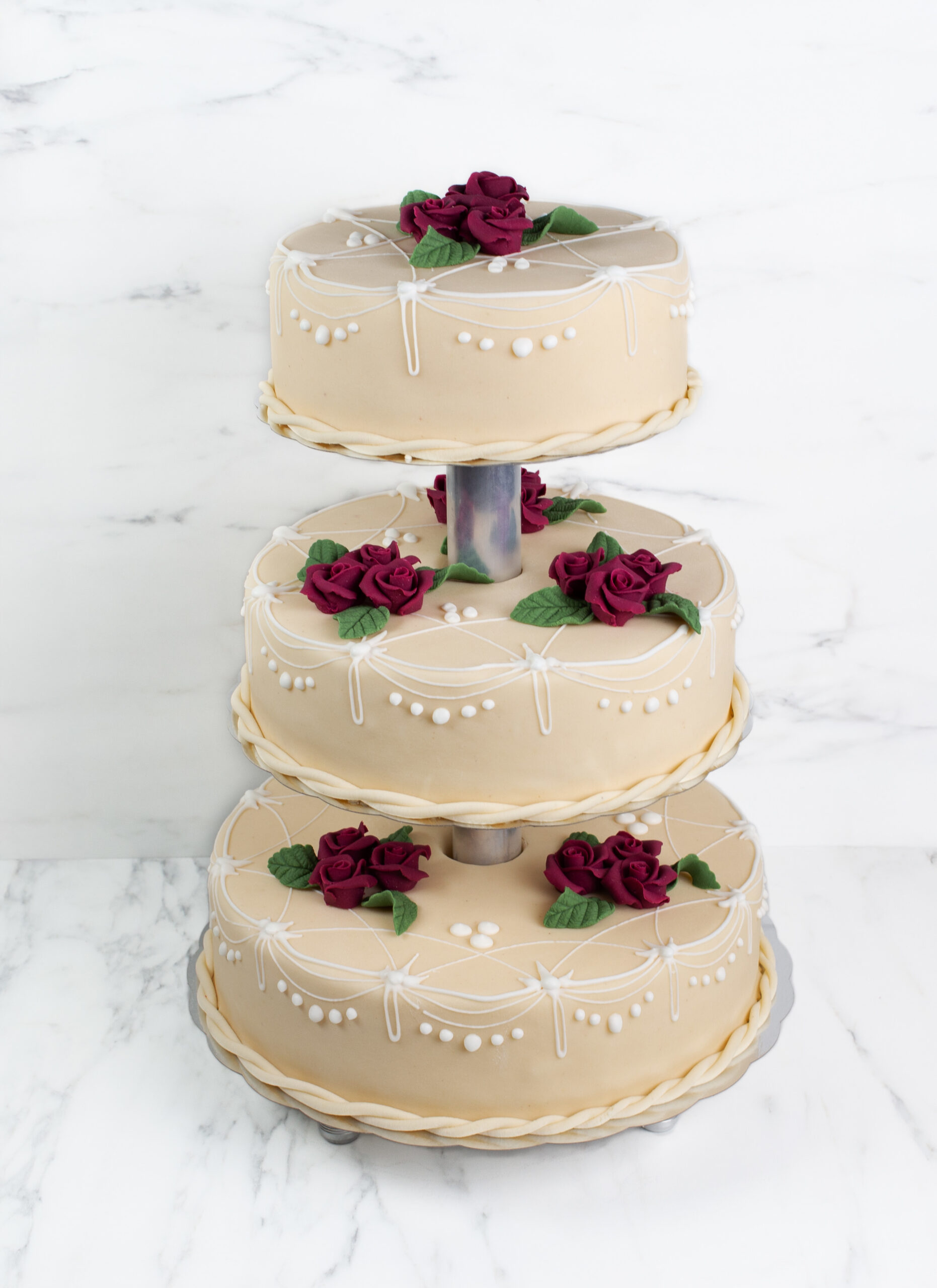 Velg mellom marsipankake med vaniljekrem, Velg mellom smaker: bringebær, jordbær og aprikossyltetøy og ekstra fyll: sjokoladebite eller valnøtter. Black & white sjokolademousse på nøttebunn eller Bringebær- og pasjonsfruktmousse på mandelbunn. Vi spesialdesigner kaken etter ditt ønske