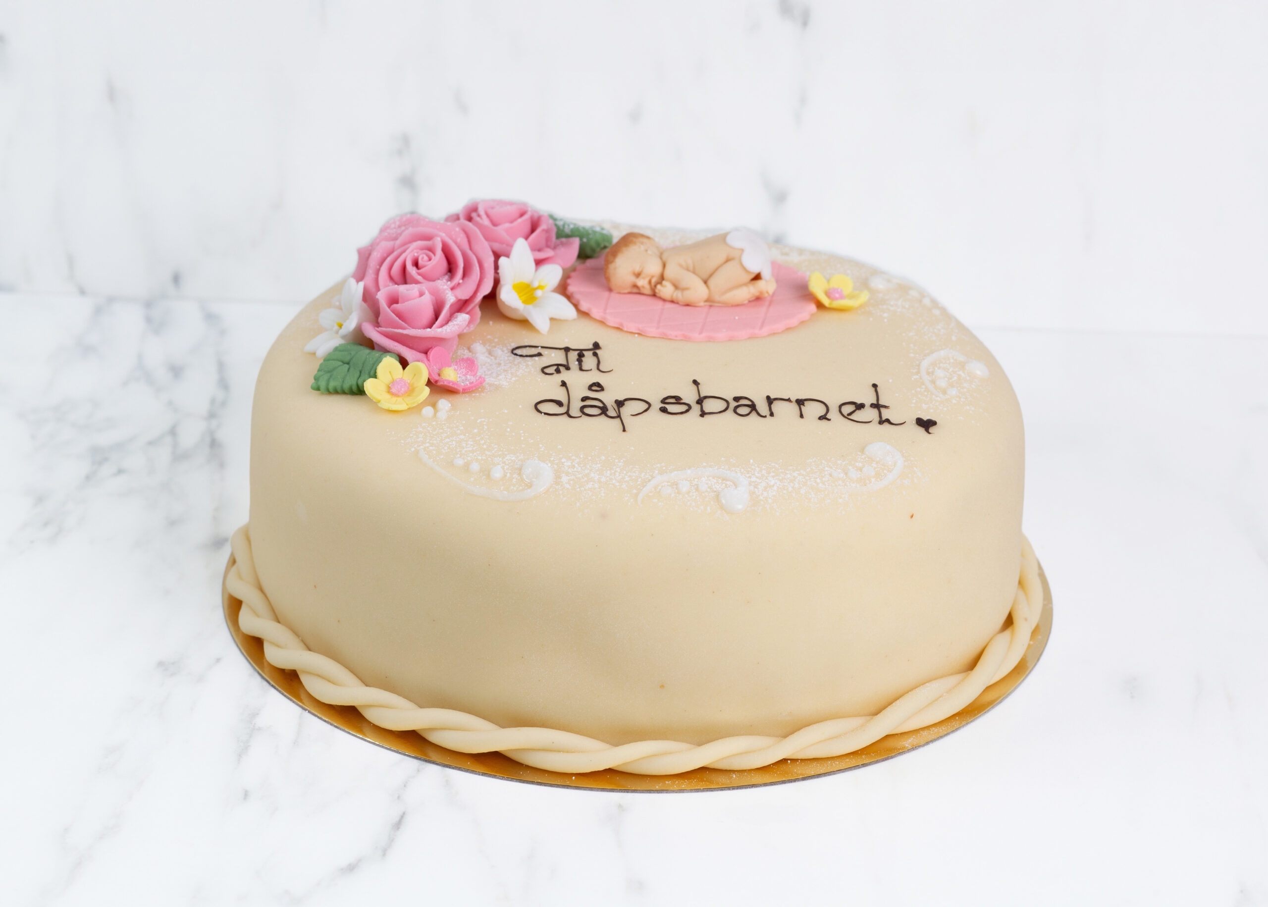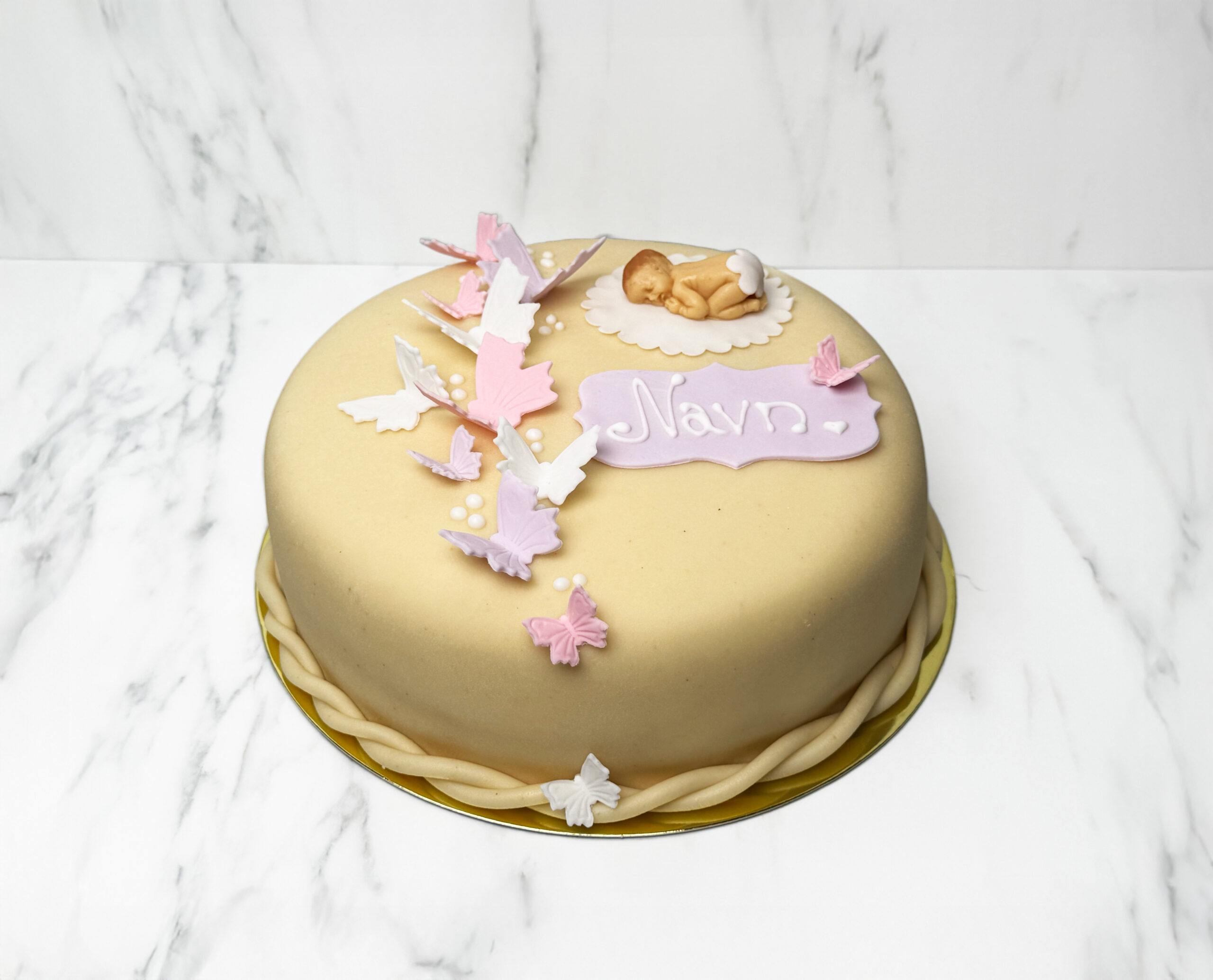 Dåpspyntet marsipankake med vaniljekrem og bringebær. NB! skriv om du ønsker sommerfugl eller rose i kommentar til kjøkken.
