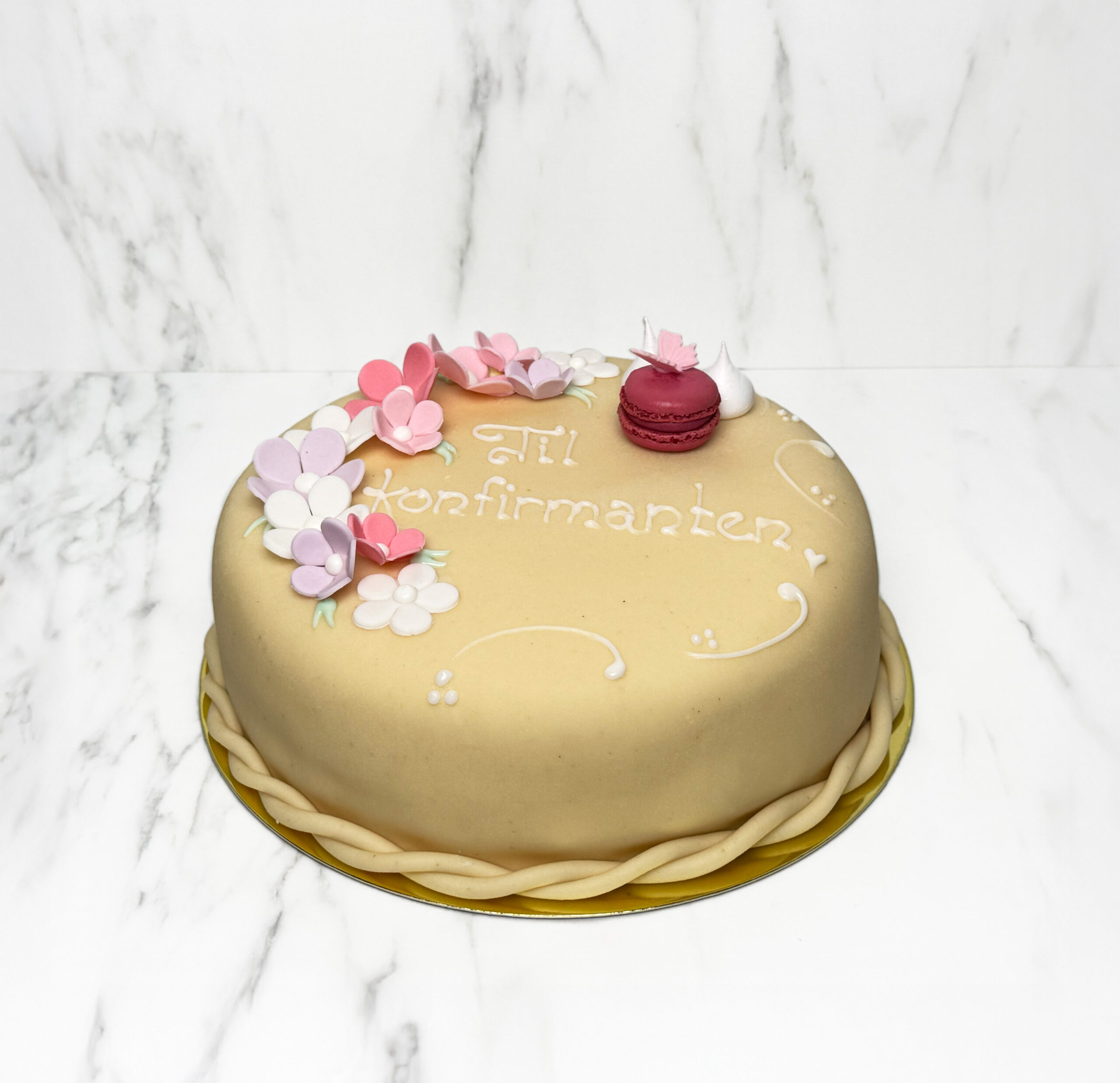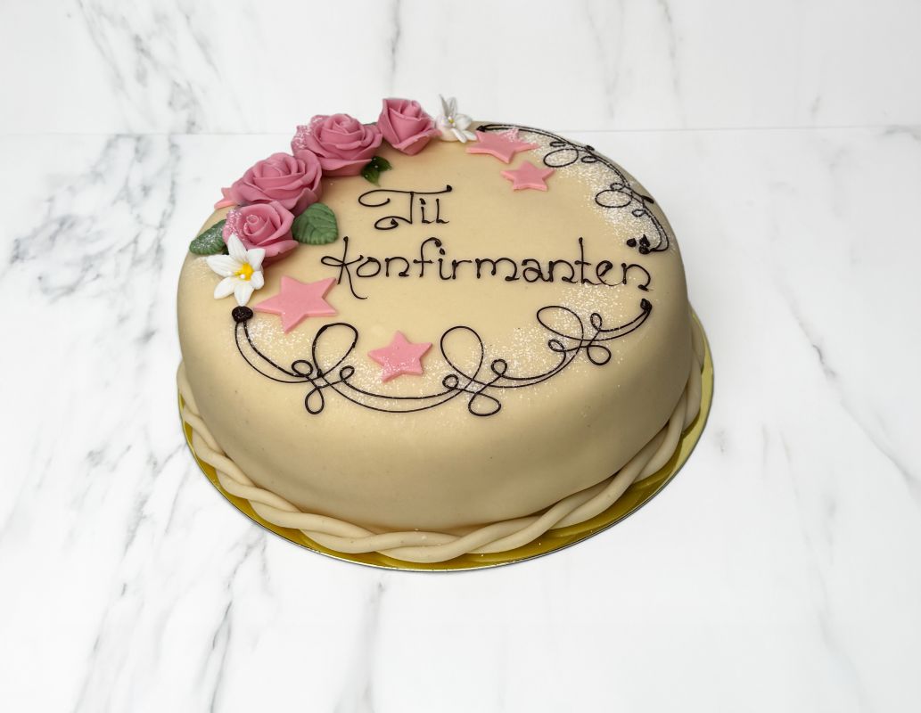Konfirmasjonspyntet marsipankake med vaniljekrem og bringebær. NB! skriv om du ønsker blomster/rose i kommentar til kjøkken