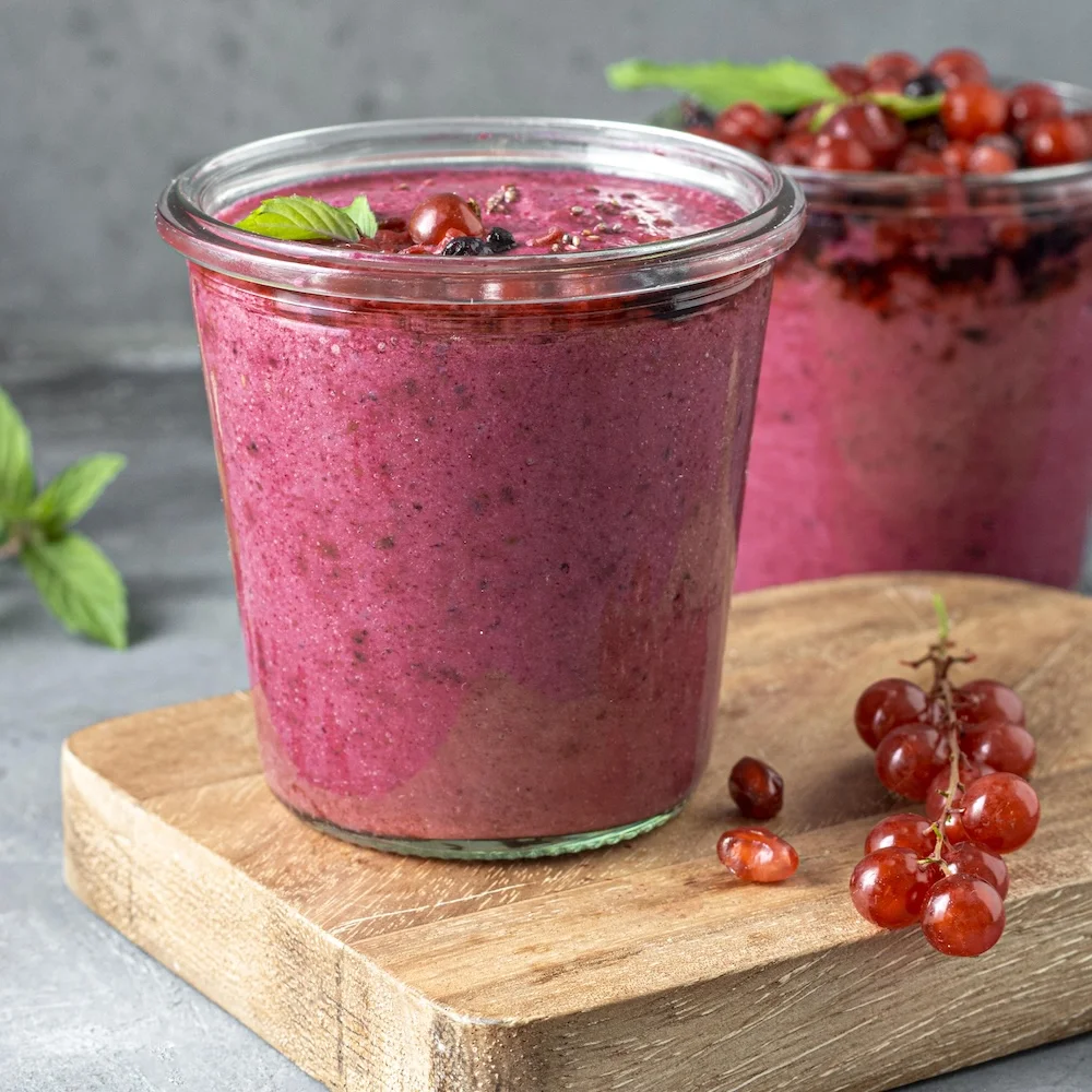 Smoothie serveres i engangsplast beger med tett lokk og sugerør.