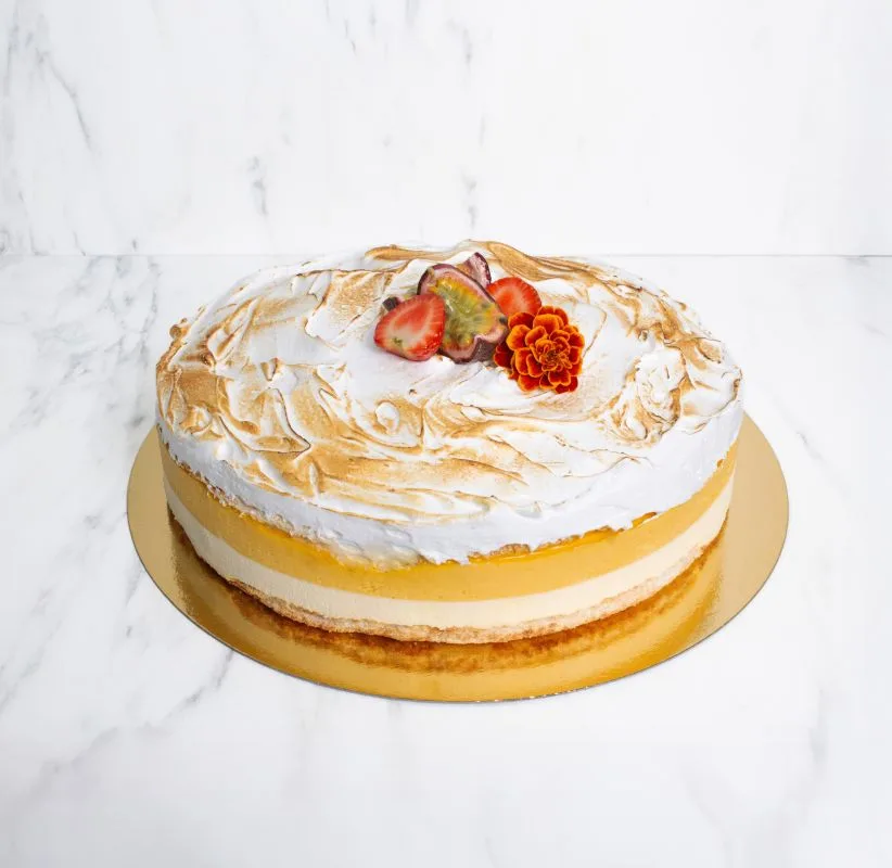 Hvit sjokolademousse, pasjonsfruktkrem og marengs på kokosbunn. Vær oppmerksom på at kakene ikke egner seg til skrift.