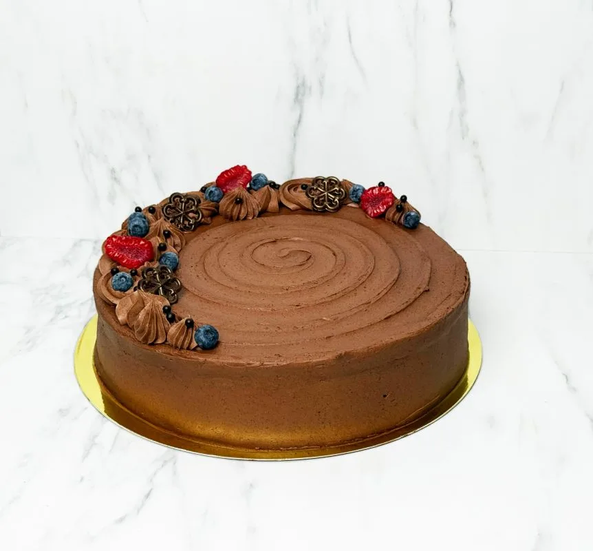 Med sjokolade smørkrem og bringebærsyltetøy. Vær oppmerksom på at kakene ikke egner seg til skrift.