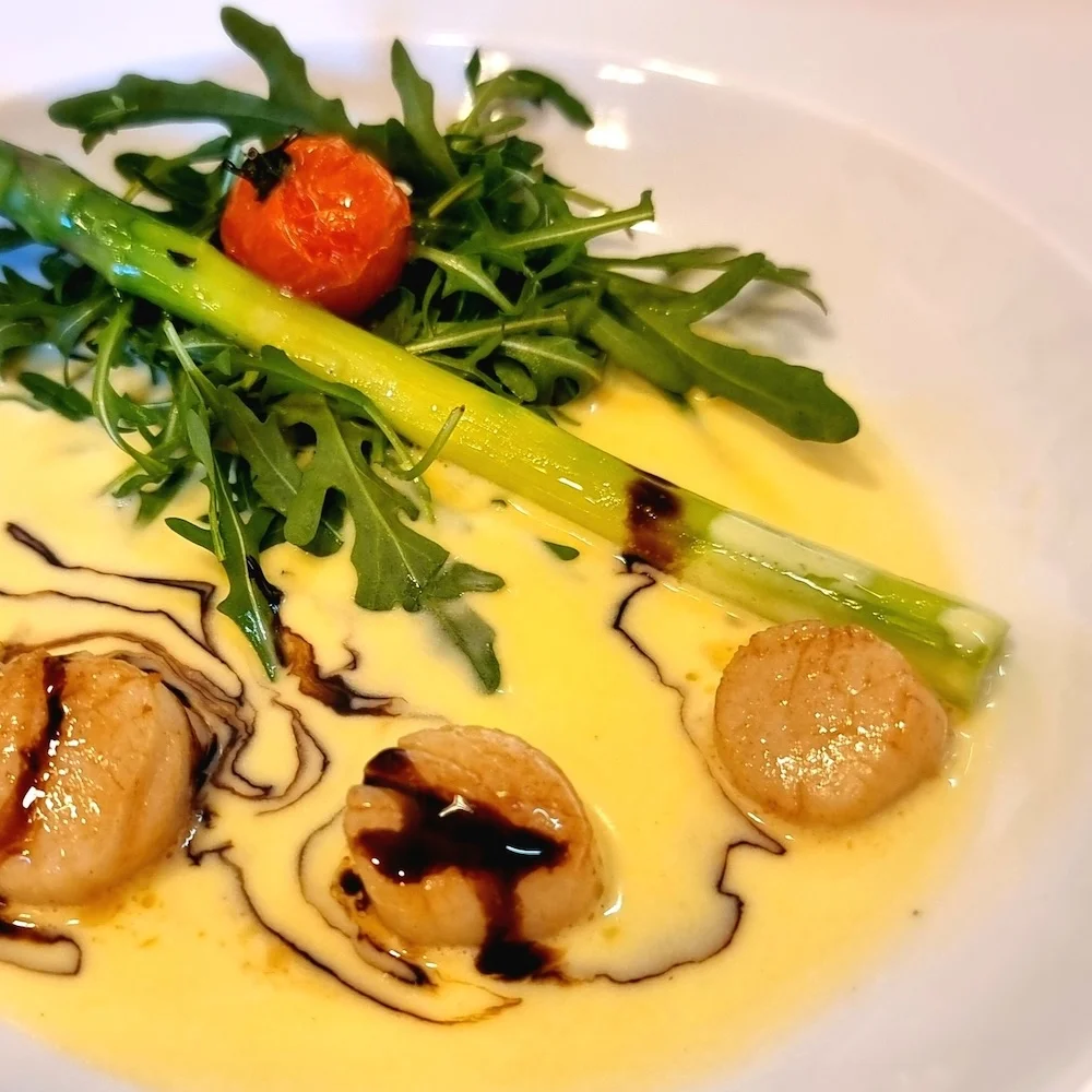 Grillet kamskjell m/ruccola salat og tomatconfite, dampet asparges, honning-balsamico vinaigrette og beurre blanc