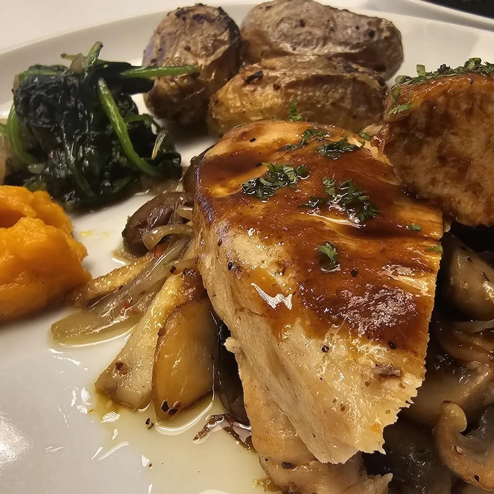 Grillet kyllingfilet m/skogsopp, søtpotetpuré, spinat og rattepoteter servert m/gåseleversaus